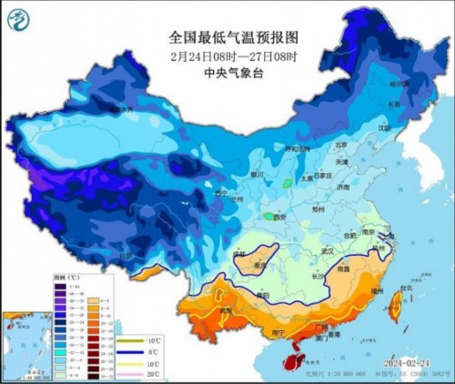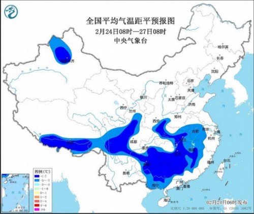据中央气象台网站消息,24日06时继续发布低温黄色预警,预计,2月24日08时至27日08时,江淮中西部、江汉大部、江南中部和西部、西南地区东部和北部、广西、广东北部以及陕西东南部、甘肃东南部、新疆沿天山地区、西藏南部等地的日平均气温较历史同期偏低5℃以上,其中,湖北中部和南部、湖南大部、江西中部、贵州大部、广西中北部、四川中西部、新疆沿天山地区等地的日平均气温较历史同期偏低7℃以上,最低气温0℃线将位于贵州西南部、广西北部、江西北部至江苏南部一带。