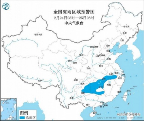 中央气象台2月24日06时继续发布冰冻黄色预警: