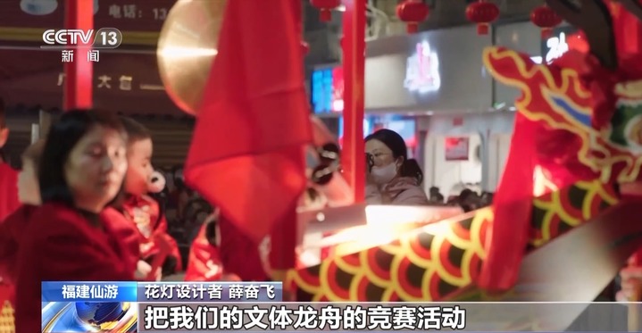 花灯设计者奋飞:设计了一些现在的龙舟,把我们的文体龙舟的竞赛活动、体育精神表现在元宵的舞台上面。因为文化值得大家去爱,我想通过这个平台把我爱的文化表现出来。