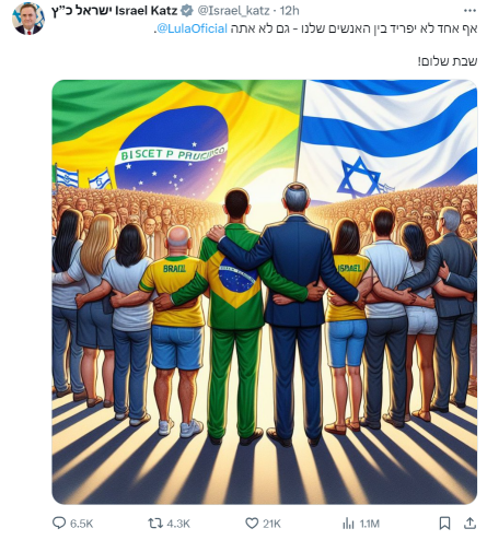 报道称,当天卡茨在社交媒体X上分别用葡语和希伯来语发帖,称“没有人会把我们的人民分开——即使是你,卢拉·达席尔瓦。安息日和平!”同时,他还配上了一张描绘“以色列和巴西友谊”的图片。