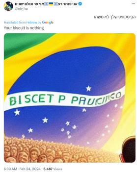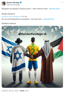 RT还称,从X网友反应来看,许多巴西人支持他们的总统卢拉。报道称,一名网友用一张更高质量的AI图片回应了以色列外长卡茨,图片中是巴西人在以色列人和巴勒斯坦人之间斡旋和平,配文喊话卡茨:“没有人会把我们的人民分开——即使是你,伊斯拉埃尔·卡茨。”↓