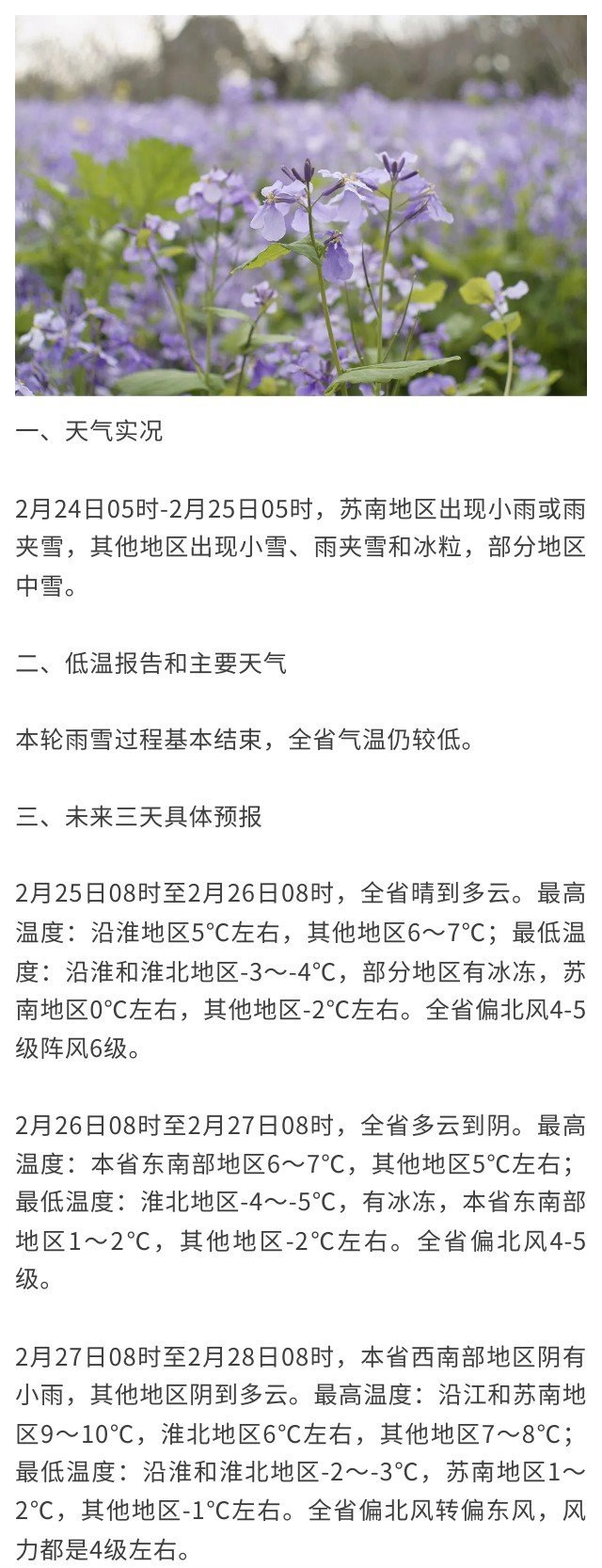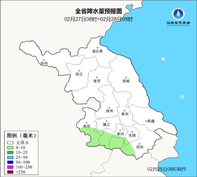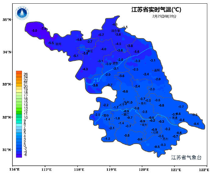 2月25日08时至2月26日08时,全省晴到多云。最高温度:沿淮地区5℃左右,其他地区6~7℃;最低温度:沿淮和淮北地区-3~-4℃,部分地区有冰冻,苏南地区0℃左右,其他地区-2℃左右。全省偏北风4-5级阵风6级。