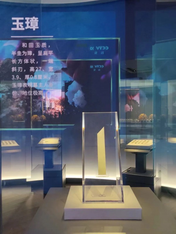 2号墓出土,呈扁平长方体状,一端斜刃,采用和田玉制作,长27—22.7厘米、宽3.9厘米、厚0.8厘米。玉璋表明墓主人身份、地位极高。