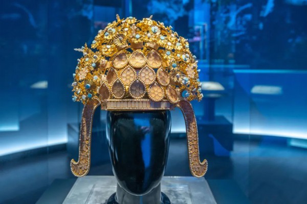 2号墓墓室棺椁外东侧,出土了一件结构相对完整的隋唐皇后冠饰,侵蚀严重。冠饰工艺精细,组合复杂,由帽壁、金花、簪(笄)、钗、翅翼等组成,花树13棵,两侧博鬓,饰件鎏金,镶嵌珠玉。花树摇曳,钿钗生辉,这是等级极高的礼冠,具有极强的礼仪象征,需等级身份最高者才能享用,也是对萧后身份的重要佐证。