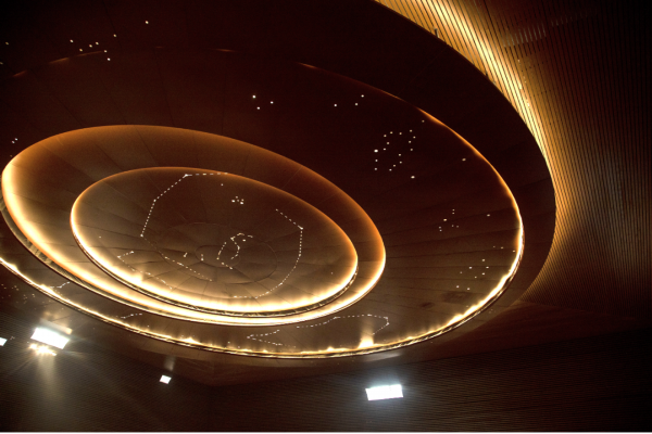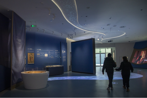 “千秋大业——隋代历史展”在隋炀帝陵博物馆第一展厅。入口处,可见顶部天花呈运河造型,蜿蜒的“河道”内星光点点,地面上全息投影映射出一条奔腾的运河,历史的星空和流动的运河在这里交织辉映,似是在讲述隋炀帝开凿大运河的丰功伟绩,以及扬州与运河相依相长的亲缘。