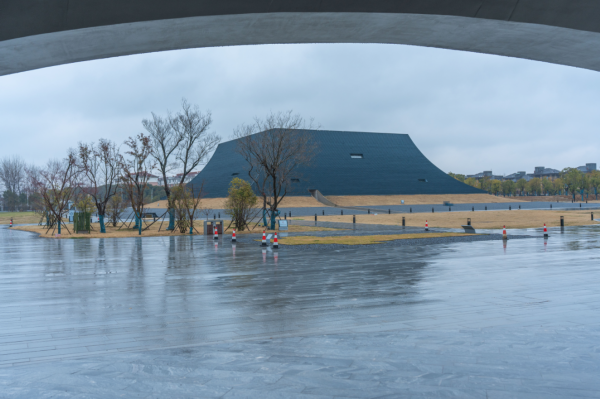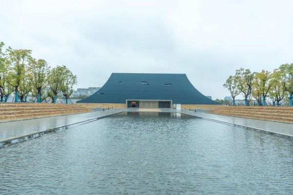 覆盖整个帝陵遗址的特制铝板瓦屋面,是帝陵遗址最重要、最具创意和辨识度的造型要素。与传统瓦片顺坡摆放的排列方式不同,帝陵遗址上的所有瓦片都是竖直站立的,这样自空中俯瞰时便会呈现出“水波纹”和“鱼鳞砌”的意象,宛若水波潋滟,鳞次栉比。