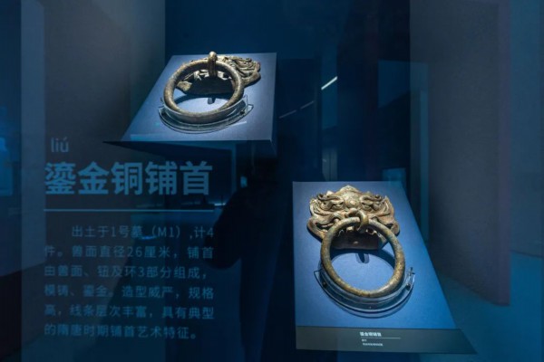 铺首由兽面、钮及环3个部分组成,为模具铸成,通体鎏金。兽面直径26厘米,与西安大明宫出土的唐代铺首尺寸相同。整体造型威严,线条层次丰富,具有典型的隋唐时期铺首的艺术特征。据推测,可能是宫殿建筑用物。