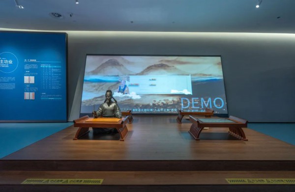 设四张案桌,一张为考生提笔书写雕像,三张用于科举体验。游客可坐于案前,触摸案上电子屏幕,穿越千年做一回考生。背景大屏显示分值,若三人同时答题,则可进行竞试。