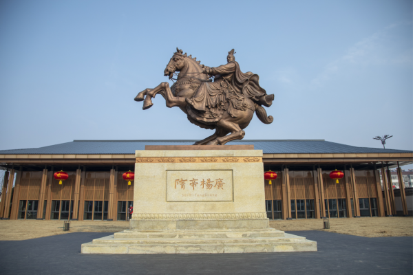雕像为铜质,本体部分高3.8米,下方则是简洁的基座,基座上部和侧面是隋朝时期的龙纹,正面是“隋帝杨广”字样。根据杨广信佛的记载,基座下部特意选用了隋朝莲花纹。