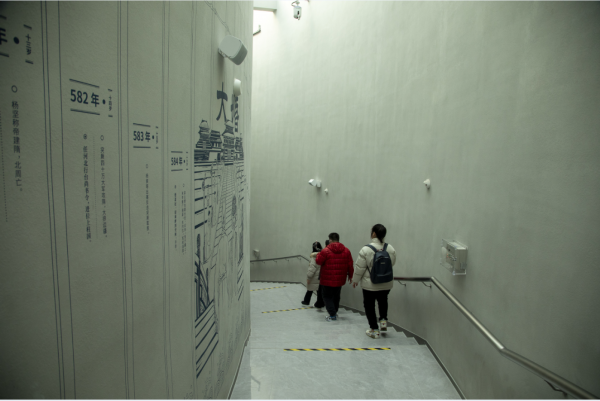 “569年,出生……584年,娶萧妃……605年,乘龙舟下江都……618年,崩于江都宫变,隋亡……”隋炀帝大事年表,选取了重要节点,文字精悍,在“大婚”“大业”“下扬州”配以巨幅绘画。这里是一条弧形楼道,沿台阶而下,宛如穿越时空隧道,慢慢走近隋炀帝的一生。