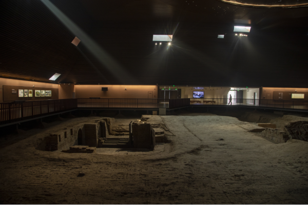 神圣星空之下的地面,50米左右见方的夯土以原状呈现在世人面前。隋炀帝墓室位于土墩正中心,萧后墓室居于其东南一侧。站在栈道上,可以近距离地观察两座墓葬的结构。
