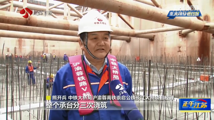 中铁大桥局沪渝蓉高铁崇启公铁长江大桥项目经理熊开兵说:“整个承台分三次浇筑,5月底前完成,承台结束后将转入主塔塔身上部结构施工。”