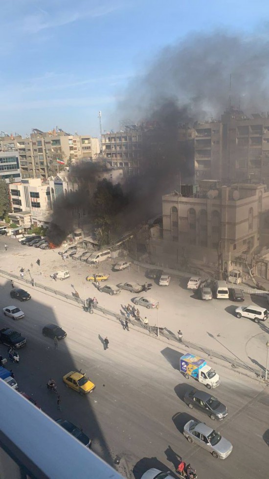 现场拍摄的图片显示,被炸的建筑紧邻伊朗驻叙利亚大使馆,整栋建筑已被夷为平地,现场浓烟滚滚,急救车辆停在外面