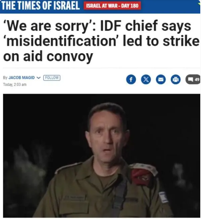 据环球时报援引法新社报道,以色列国防军总参谋长哈莱维日前在一份视频声明中就4月1号慈善组织“世界中央厨房”7名员工遭以色列袭击身亡事件道歉。以色列为什么道歉?它们在害怕什么?