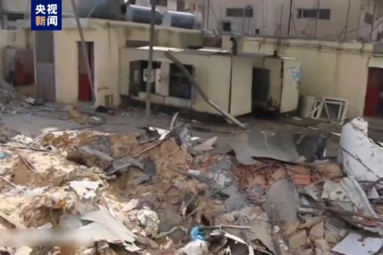 一段公布的画面显示,汗尤尼斯阿迈勒医院内,有大片遭到轰炸后塌陷的地面和残砖瓦砾,周围车辆遭到不同程度损坏,医院大楼内部的医疗设备、办公室等也遭到严重破坏。