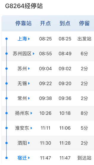 原上海往来宿迁的G8264/G8263次调整运行区段为上海往来盐城。