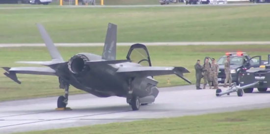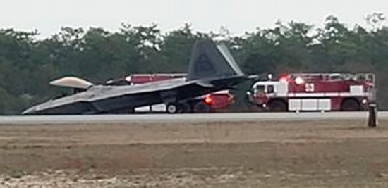 在埃格林空军基地发生故障、机头着地的F-22战机(上)和在嘉手纳空军基地发生故障、机头着地的F-35B战机