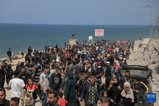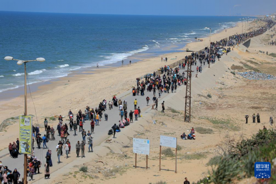 这是4月14日在加沙地带中部拍摄的向北返家的人群。
