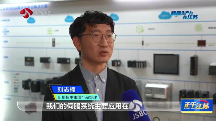 江苏台记者尹美又:“在生产线上,各种灵活挥舞手臂的工业机器人已经很常见了。而控制着这些工业机器人运转的就是我手上的这个伺服系统,它可以说是工业机器人的最强大脑,你知道吗?全国每四台工业机器人的‘最强大脑’就有一台来自苏州的汇川技术。”
