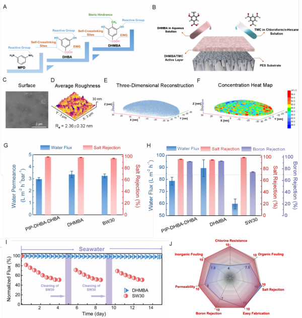 团队设计并合成了一类间苯二酚衍生物—3,5-二羟基-4-甲基苯甲酸(DHMBA),借助“共溶剂辅助”界面聚合的制膜方法,提高了反应物从水相迁移至有机相的扩散速率,构建了无缺陷、且具有优异“水/盐选择性”的三维网络聚合物薄膜结构,验证了材料优异的反渗透基础分离性能(与Dupont公司SW30系列海淡膜相当)。