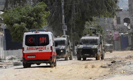 4月20日,在约旦河西岸城市图勒凯尔姆,以色列军车阻止救护车进入冲突现场。巴勒斯坦卫生部20日发表声明说,以色列军队自18日进入约旦河西岸城市图勒凯尔姆开展军事行动以来已造成至少13名巴勒斯坦人死亡。新华社发(艾曼·诺巴尼摄)