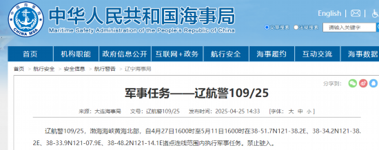 据中国海事局网站消息,大连海事局发布航行警告,4月27日16时至5月11日16时,渤海海峡黄海北部部分海域执行军事任务,禁止驶入。