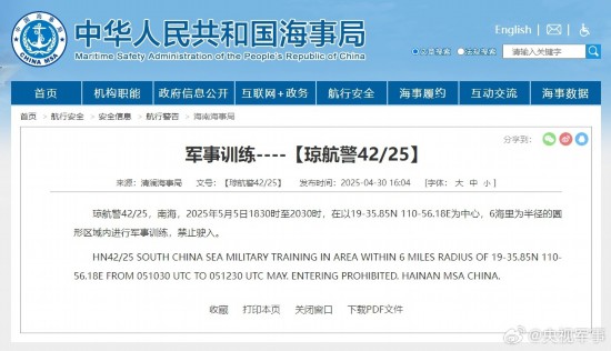 据中国海事局网站消息,清澜海事局发布航行警告,5月5日18时30分至20时30分,南海部分水域进行军事训练,禁止驶入。