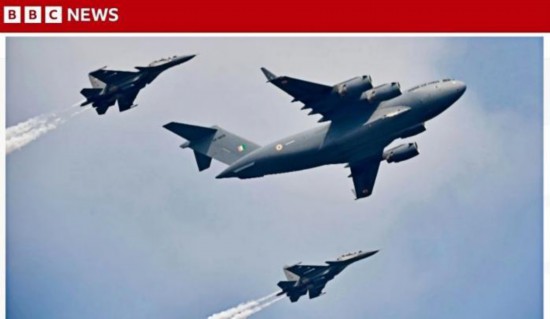 印军战斗机伴随运输机飞行。图/英国广播公司网站报道