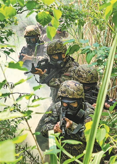 近日,武警广西总队桂林支队开展战术训练。图为官兵在山林地搜索前进。施晨洲摄