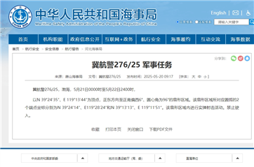 据中国海事局网站消息,唐山海事局发布航行警告:5月21日0时至5月22日24时,渤海部分区域进行实弹射击,禁止驶入。