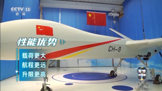 中国航天空气动力技术研究院 房帅:与彩虹家族其他产品不同,彩虹-9具有24.8米的翼展,这就给整个飞机提供了更大的升力,可以支撑它有更大的载荷能力、更远的航程和更高的升限。这样它就有更长的制空时间,可以做对地侦察,对远距离的目标进行打击。