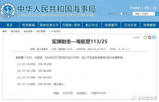 据中国海事局网站消息,湛江海事局发布航行警告,5月28日7时30分至29日23时50分,北部湾部分海域进行实弹射击,禁止驶入。