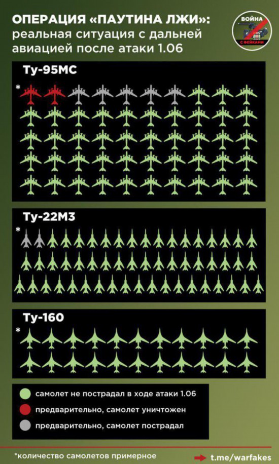 俄方的分析认为,乌克兰方面实际上仅仅可能摧毁了两架图-95战略轰炸机及一架安-12运输机。其余受损飞机在维修后均可恢复作战能力,乌克兰方面宣称的战果并不符合实际。