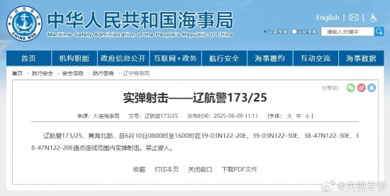 据中国海事局网站消息,大连海事局发布航行警告,6月10日8时至16时,黄海北部部分海域实弹射击训练,禁止驶入。