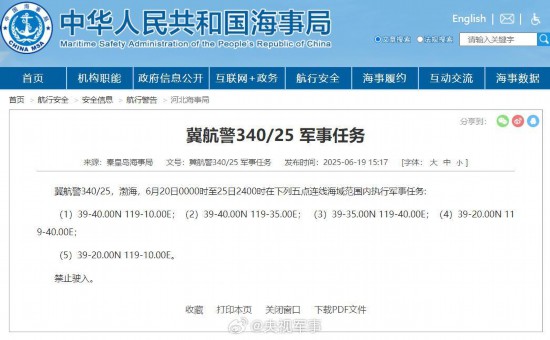 据中国海事局网站消息,秦皇岛海事局发布航行警告,6月20日0时至25日24时,渤海部分海域有军事任务,禁止驶入。
