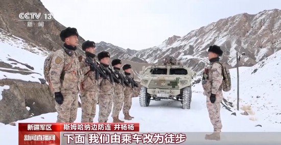 斯姆哈纳边防连 井杨杨:前方道路积雪较厚,下面,我们由乘车改为徒步,距前方点位还有2.5公里,下面我们对武器装备进行检查。