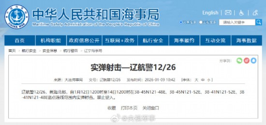 据中国海事局网站消息,大连海事局发布航行警告,1月12日12时至14日12时,黄海北部部分海域实弹射击,禁止驶入。