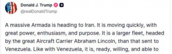 特朗普在其个人社交媒体平台真实社交上发声称,一支庞大的舰队正前往伊朗,已准备好迅速履行其使命。他还称,希望伊朗能够迅速坐到谈判桌前,并就一项“对各方都有利的协议”进行谈判。他强调,伊朗不能拥有核武器。特朗普称,正是因为伊朗方面此前未达成协议,美国去年发动了对伊朗的打击行动。他威胁,“下一次打击将更猛烈”。