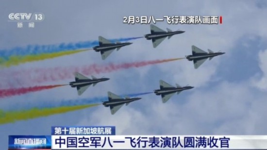 今明两天,第十届新加坡航展对社会公众开放。今天上午,中国空军八一飞行表演队驾驶6架歼-10系列表演机完成了在第十届新加坡航展的最后一场飞行表演,以一系列高难度特技动作在碧海蓝天间绘就多彩航迹,书写了和平与友谊的动人篇章。