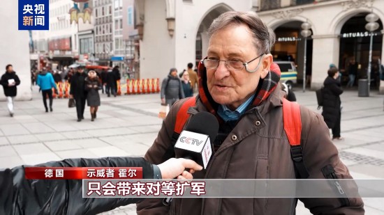 示威者 霍尔:我们像往年一样再次抗议所谓的慕尼黑安全会议,但实际上这是拱火战争的会议。扩军备战实际上从未带来和平,只会带来对等扩军,军备升级,军备竞赛,以及巨大的战争风险。