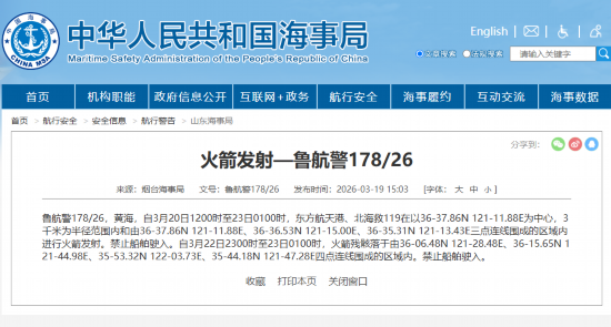 据中国海事局网站消息,烟台海事局发布航行警告,3月20日12时至23日1时,黄海部分海域进行火箭发射,禁止船舶驶入。