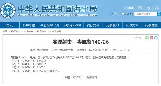 据中国海事局网站消息,珠海海事局发布航行警告,3月24日至27日每天8时至17时,南海部分海域进行实弹射击,禁止驶入。