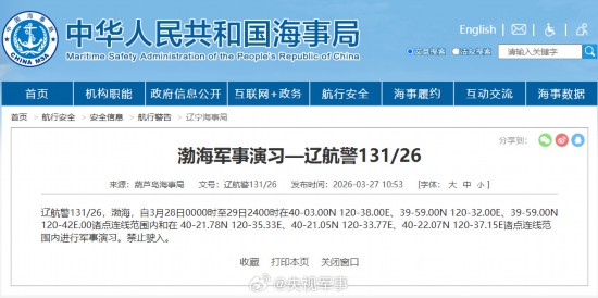 据中国海事局网站消息,葫芦岛海事局发布航行警告,3月28日0时至29日24时,渤海部分海域进行军事演习,禁止驶入。