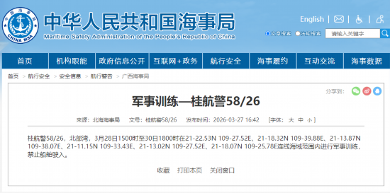 据中国海事局网站消息,北海海事局发布航行警告,3月28日15时至30日18时,北部湾部分海域进行军事训练,禁止船舶驶入。