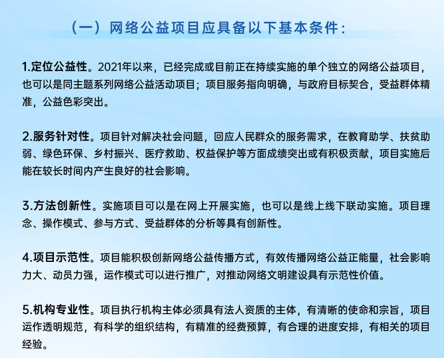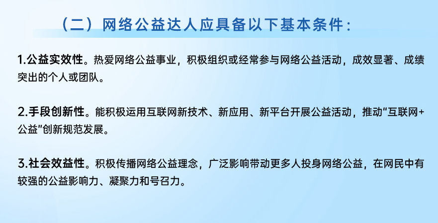其中,申报推荐采取组织推荐、网友推荐和个人自荐相结合的形式。申报参加公益行动分为网络公益项目和网络公益达人2个类别,需满足如下条件: