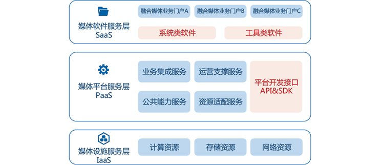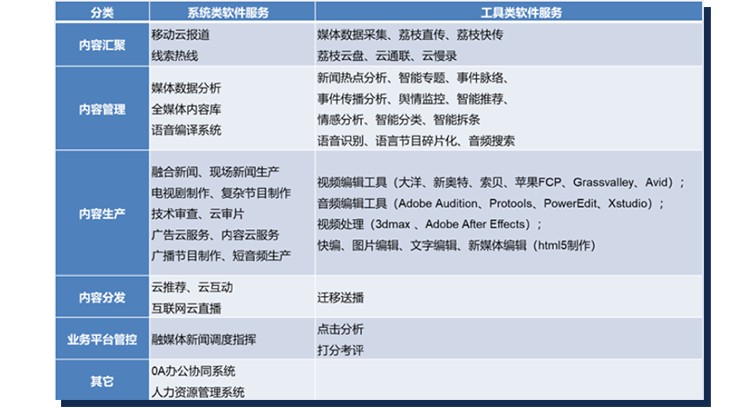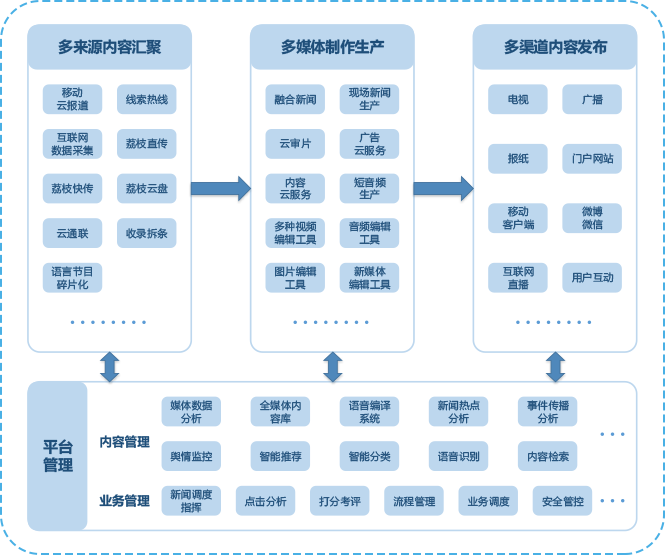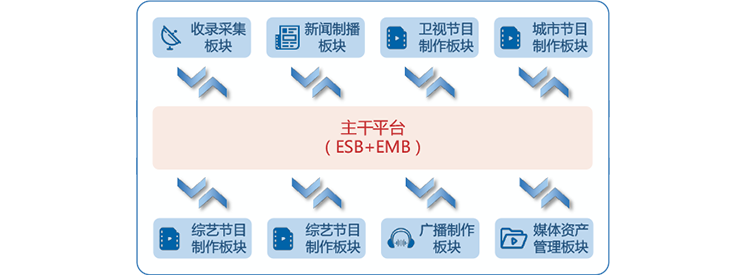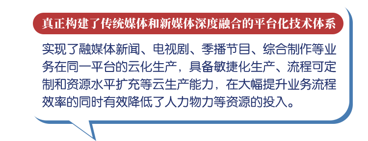 整合广播、电视和新媒体等原有全台网架构下的技术系统,实现了多个内容板块的内容汇聚、生产和发布等业务在同一平台的云化生产。